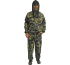 В комплекте укороченная куртка с капюшоном на молнии, имеет 2 накладных кармана. Брюки прямые с поясом на резинке, имеют 3 накладных кармана, низ брюк регулируется фиксаторами. Материал: дюспа бондированная.