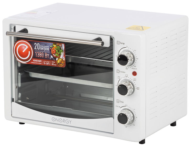 Мощность - 1380 Вт. Внутренний объём - 20 литров. Режим конвекции! Термостат с диапазоном рабочих температур духовки - 70-230 градусов. Возможность раздельного включения верхнего и нижнего ТЭНов духовки. Таймер 60 минут. В комплекте противень и решетка. Вес ~ 5,9 кг.