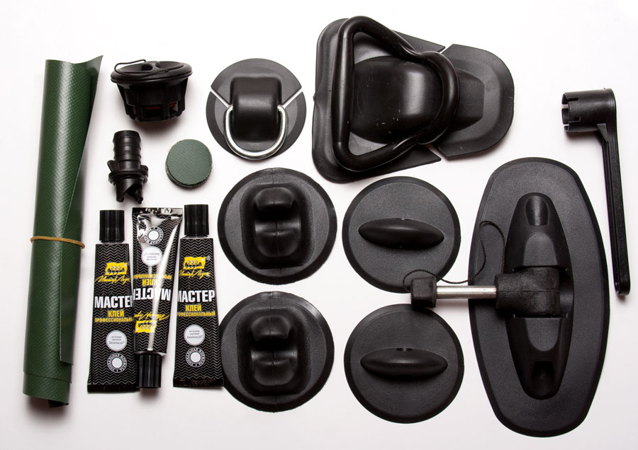 В набор входит: ткань ПВХ не менее 3 кв.дм.; клей в тубе - 3 шт; шайба из ПВХ ткани диаметром 35 мм - 15 шт; рым малый с полукольцом; рыи большой; уключина поворотная; шайба леера (овал) - 2 шт; защелка весла - 2 шт; клапан для лодки ПВХ с втулкой клапана; наполнения; ключ для установки втулки клапана, наконечник меха.