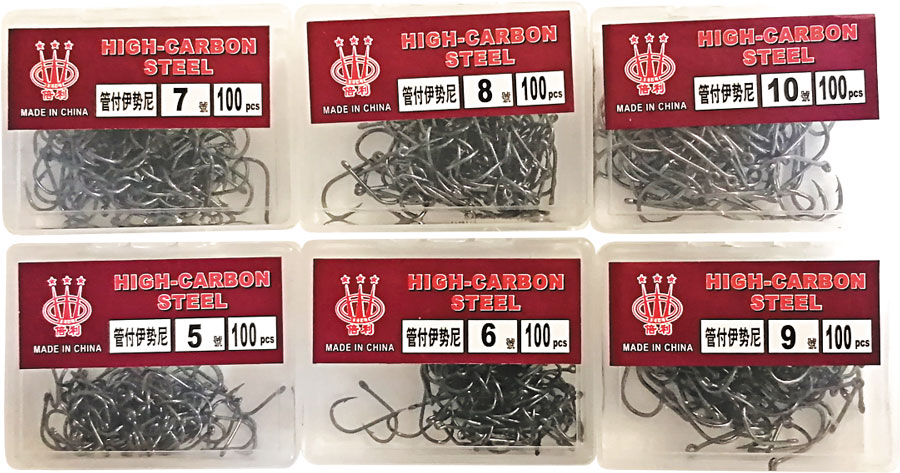 В наборе крючки HIGH-CARBON STEEL шесть размеров (№5, №6, №7,№8, №9 и №10) по 100шт