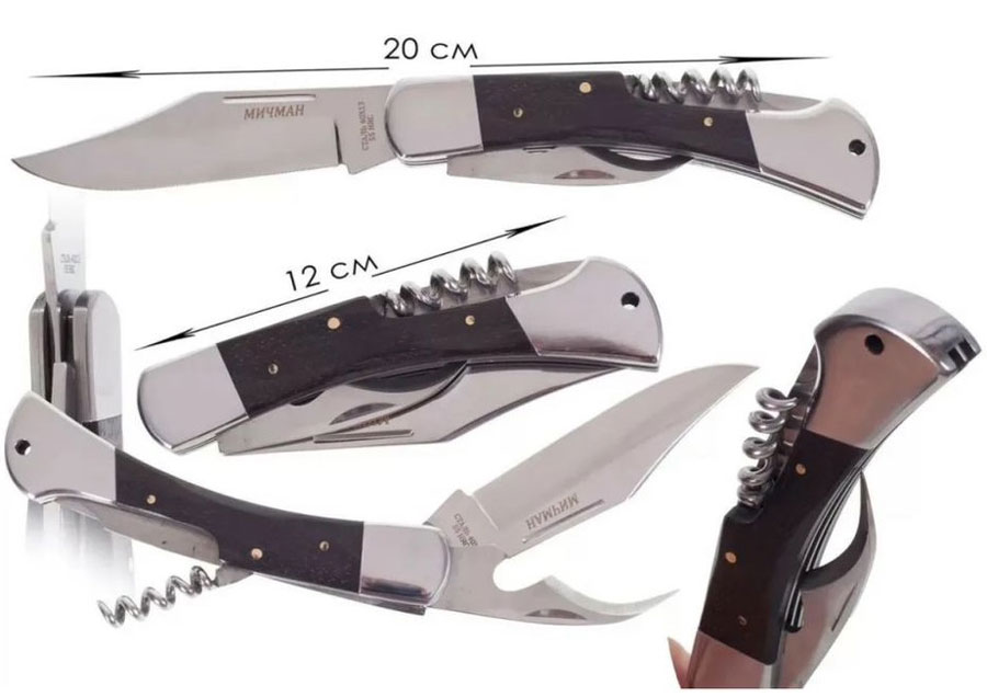 Складной нож со стопором, в чехле. Имеет основное лезвие из высокоуглеродистой стали, открывашки и штопор.Лучший друг путешественника. Длина клинка 85 мм Ширина клинка 23 мм Длина 230 мм Ширина 34 мм Толщина 18 мм Вес 204 г.