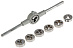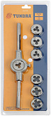Набор для нарезания внешней резьбы. Плашки изготовлены из легированной стали. Размеры резьбы - M3, М4, М5, М6, М8, М10, М12. Плашкодержатель.