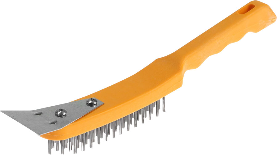 Используется для снятия ржавчины, старой краски и прочих загрязнений. Имеет встроенный шпатель (ширина 4,5 см) для дополнительных усилий при чистке поверхностей. Стальная щетина (5 рядов). Размеры: 30х4,5х4 см.