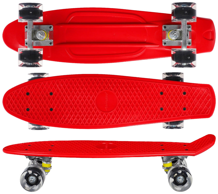 Компактный и манёвренный скейтборд ? отличный выбор для юных начинающих скейтбордистов (от 6 лет). С ним ребёнок научится держать равновесие и разовьёт мышцы ног. Прочная пластиковая с ребристой поверхностью обеспечивает хорошее сцепление с подошвой обуви и не позволяет ногам скользить по доске. Усиленная алюминиевая подвеска колёс. Максимальная нагрузка: 50 кг. Светящиеся полиуретановые колёса размером 60х45 мм. Размер: 56х15 см. Вес ~ 1,5 кг.
