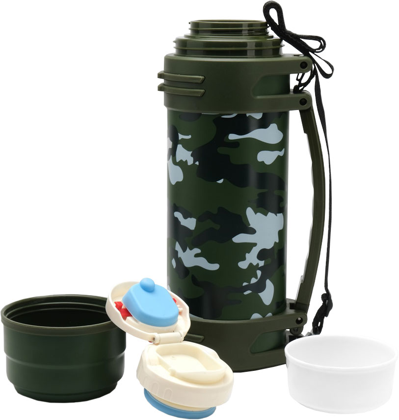Корпус из высококачественной нержавеющей стали с камуфляжной окраской. Вакуумная колба. Сохраняет тепло до 24 часов. Герметичная откидная крышка не протекает, обеспечивает теплоизоляцию. Ремешок и ручка для удобства переноски. Две кружки.