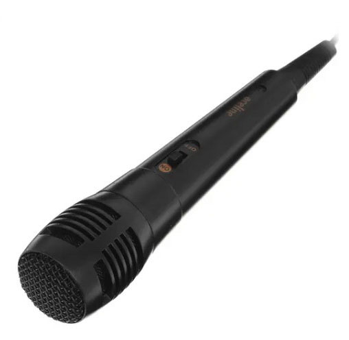 Вокальный всенаправленный проводной микрофон. К звуковоспроизводящему устройству подключается за счет кабеля длиной 2,5 метра с разъемом jack 6.3 мм. Рабочая частотная полоса - 60-14000 Гц. Чувствительность - 75 дБ. Лёгкий прочный пластиковый корпус. Кнопка включения. Вес - 180 гр.