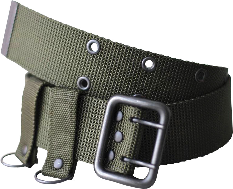 Ремень армейский с люверсами состоит из поясного ремня с двухшпеньковой пряжкой и двумя шлевками с полукольцами; Регулировка по длине в широком диапазоне; Ремень изготовлен из ременной ленты оливкового цвета; Ширина ремня 5 см, максимальный размер талии 125см.