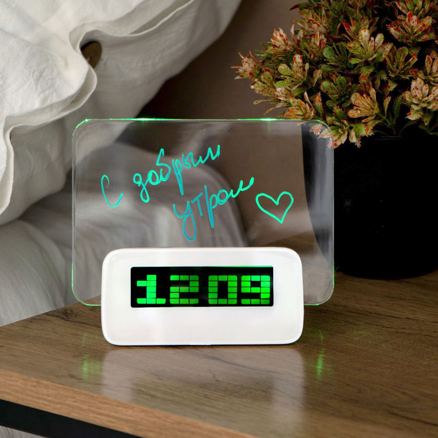 Настольные электронные часы с будильником, термометром и панелью для записей. Оставьте на прозрачной пластиковой панели сообщение при помощи специального маркера ? и после прочтения его легко можно будет стереть! Такой будильник наверняка подойдет в качестве подарка человеку, который ценит оригинальные аксессуары и привык максимально функционально использовать пространство ? к примеру, на рабочем столе. LED дисплей и панель для заметок со светодиодной подсветкой. На экране отображается: время, дата, температура. 3 настраиваемых будильника и напоминание о дне рождения. Размеры: 120х140х65 мм. Работают от 3-х батареек типа ААА или от USB (кабель в комплекте).