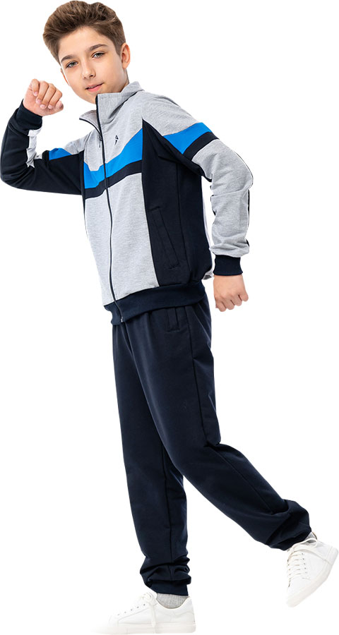 В комплекте: спортивная кофта на молнии, брюки. Ткань: футер 2-х нитка. Состав: 75% хлопок, 20% полиэстер, 5% эластан.