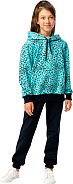 В комплекте: кофта с капюшоном, брюки. Ткань: футер 2-х нитка. Состав: 75% хлопок, 20% полиэстер, 5% эластан. Покрой: прямой, лёгкая зауженность брюк к низу.