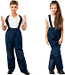 Ткань: мембрана 3000/500. Состав: 100% полиэстер. Утеплитель: синтепон 150 г/м?. Покрой: прямой, с отстёгивающейся спинкой и регулируемыми лямками. Снегозащитные фонарики внизу подкладки. На коленях и внизу брюк настрочные усилители.