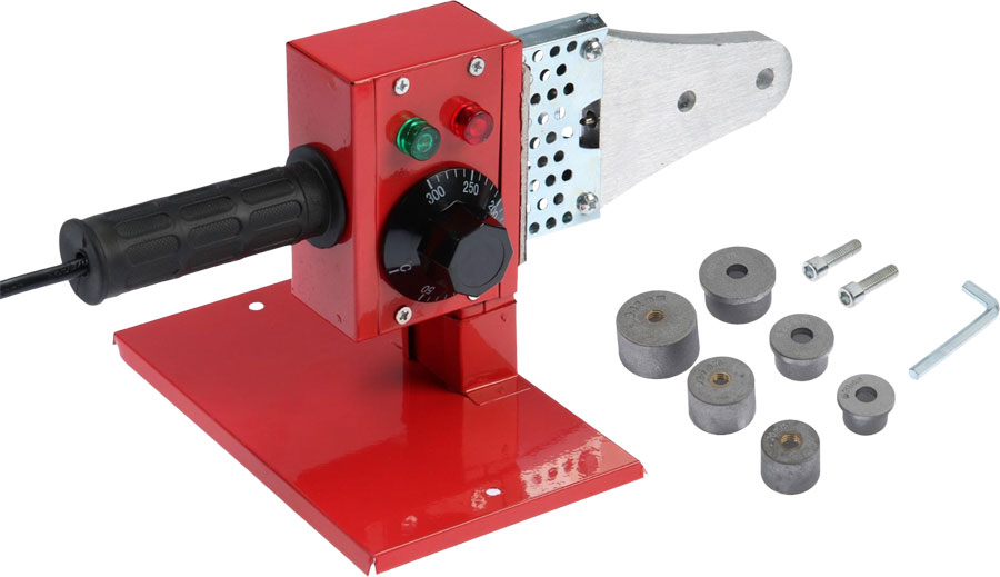 Для быстрого и лёгкого образования надежного соединения систем из разных видов полипропиленовых труб. Рабочая температура регулируется от 50°С до 300°С. Мощность - 600 Вт. В комплекте представлены нагревательные насадки с тефлоновым покрытием диаметром 20, 25, 32 мм. Удобная подставка. Индикаторы работы. Вес ~ 0,9 кг.