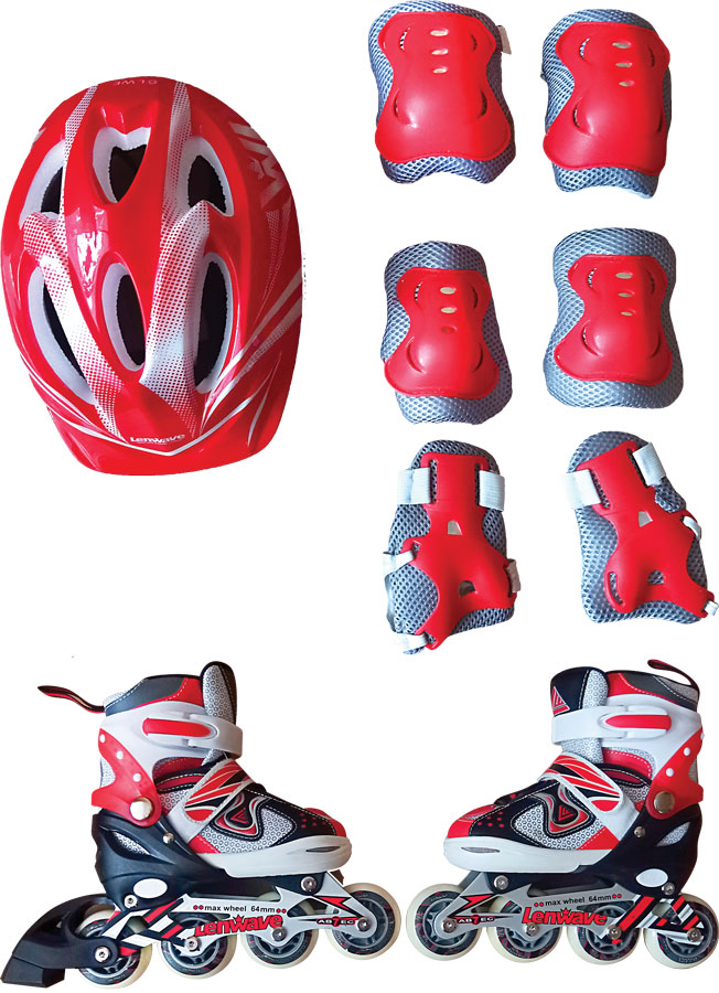 В комплекте роликовые коньки с системой быстрой регулировки размера, а также полный набор экипировки для безопасного катания (шлем, перчатки, налокотники и наколенники). Регулируемый размер: 30-33.