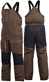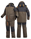 Очень тёплый и продуманный зимний костюм из современных материалов. Куртка со съёмным утепленным капюшоном с козырьком с регулировкой по лицевому вырезу, с 2 накладными карманами с клапанами, 2 нагрудными на молнии, 1 внутренним. Планка на кнопках прикрывает ?молнию?, уменьшая теплопотери. Куртка прямого силуэта удлинённая до середины бедра на кулисе, по линии талии. Полукомбинезон свободного не стесняющего движений покроем. Высокая спинка надёжно защищает спину от холодного воздуха. По талии регулируется по объёму. Широкие бретели регулируют длину по росту. Три карманы на полукомбинезоне. Область коленей усилена накладками. Центральная застёжка на двухзамковой "молнии". В нижней части бокового шва разрезы с ?молниями?, разъёмные снегозащитные муфты на ?велькро?, обеспечивающие удобное обувание даже высокой и объёмной обуви. Утеплитель ?Слайтекс? - 300 гр/м2 (куртка), 200 гр/м2 (полукомбинезон). Вес ~ 2,8 кг.