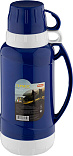 Лёгкий и вместительный термос с пластиковым корпусом и стеклянной колбой с двойными стенками. Герметичная пробка. Ручка для переноски. Две пластиковые чашки с ручками.