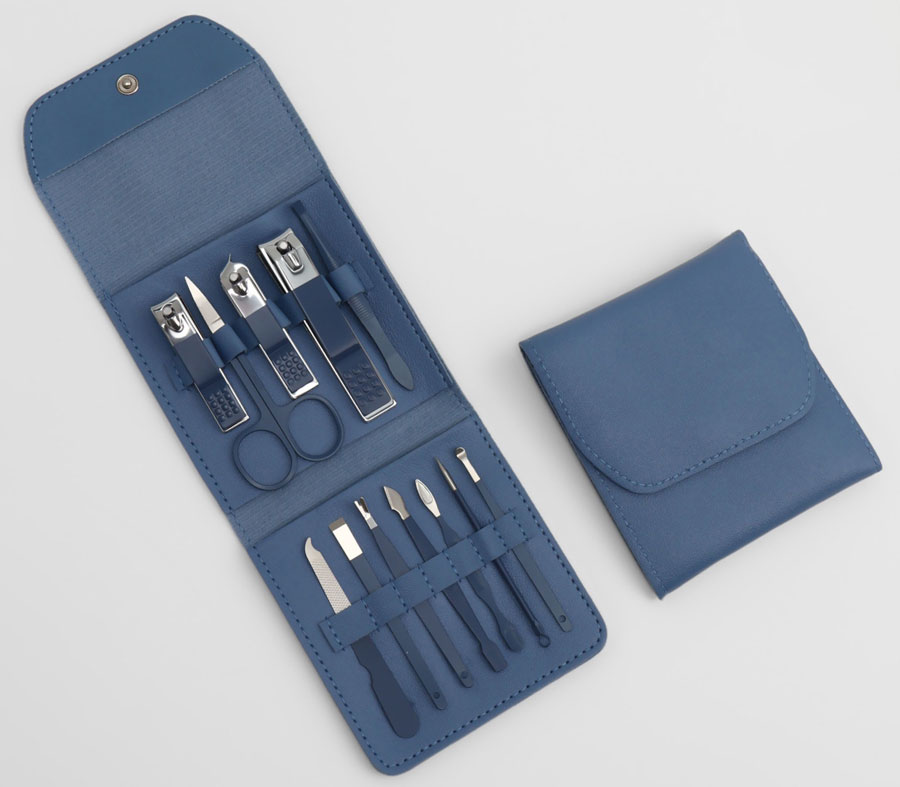 В наборе: кусачки, ножницы, пилка, ухочистка, шабер, книпсер прямой, книпсер скошенный, книпсер большой, пушер, триммер, педикюрная лопатка, косметическая игла. Удобный дорожный чехол.