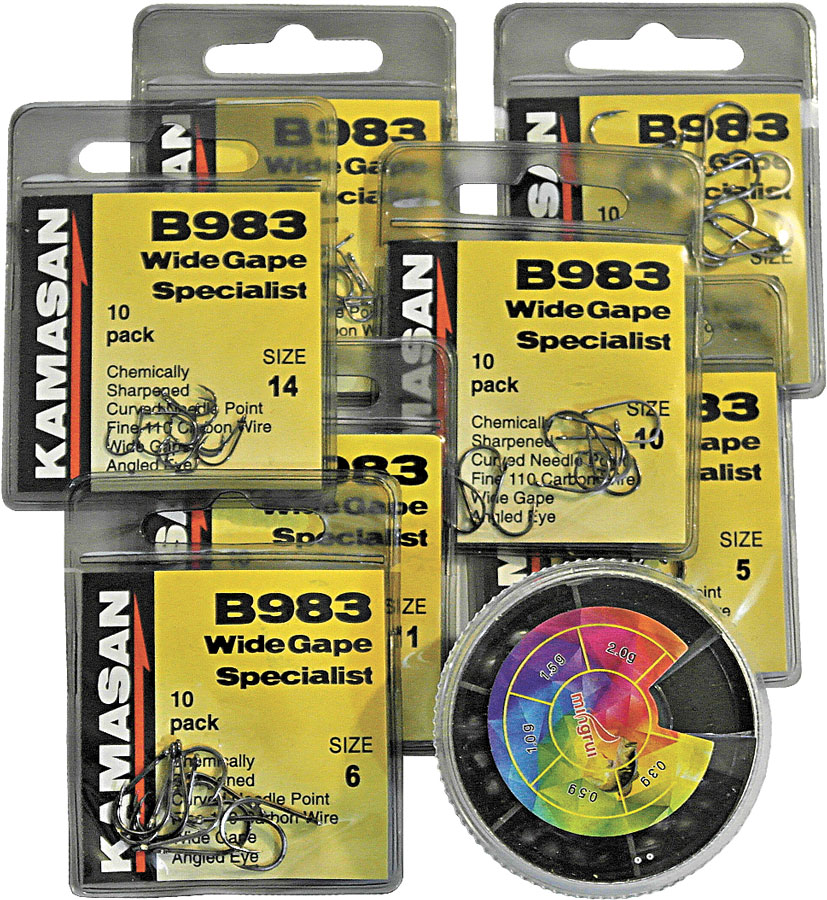 В наборе крючки KAMASAN семь размеров (№5,№6, №8,№10, №11, №12, №14) по 10шт. И набор грузил-дробинок средний (от 0,3 до 2,0гр)