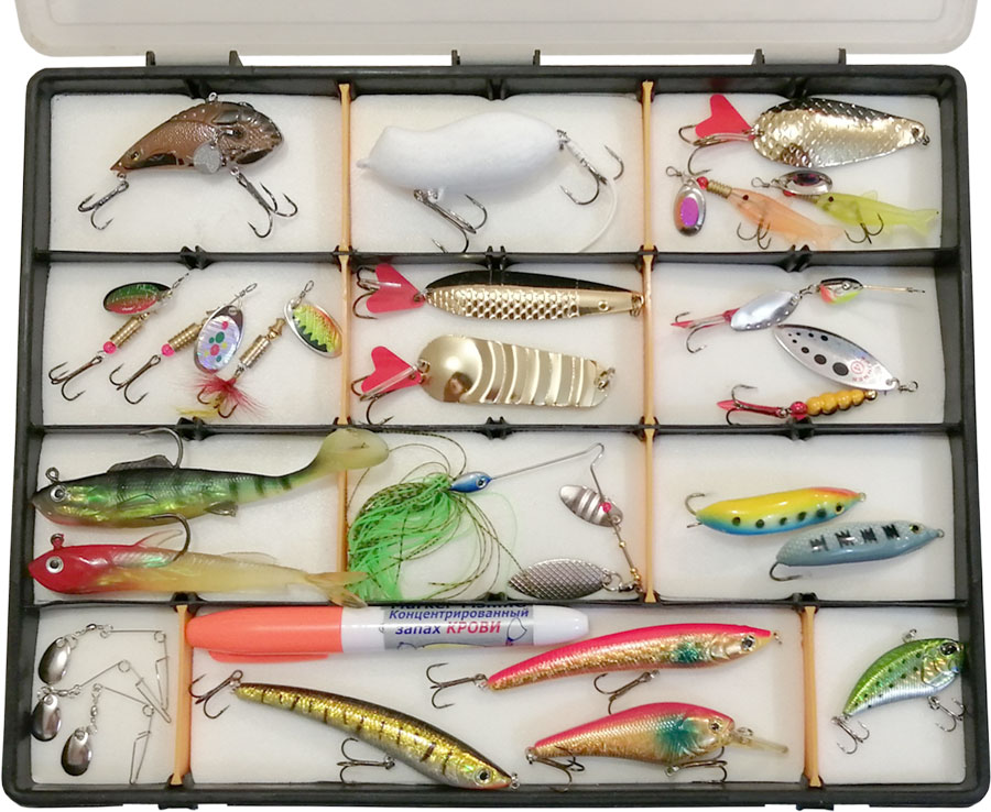 В набор входит: Воблер-3шт, маркер не смываемый водой и канцентрированным запахом крови-рыбы, ратлин 2 шт,\r\nспиннербейт-4шт, блесна "незацепляйка"-2шт, блесна "вертушка"-7шт, блесна "колебалка"-3шт, приманка "мышка" с двумя \r\nтройниками-1шт, приманка силиконовая-2шт. Набор собран в удобном, рыболовном ящике с ручкой, размером 29*36*7см.