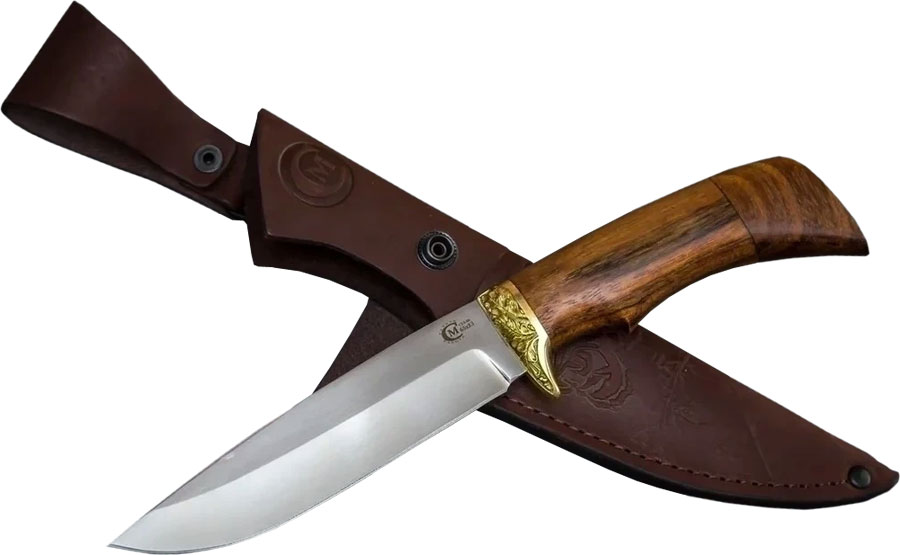 При ковке клинка использовалась сталь 65х13, твердость которой составляет 55 - 57 HRC. Для изготовления рукояти используется литье латунь, ценные породы дерева. Фирменный чехол-ножны из натуральной кожи. Толщина клинка 2.4 мм. Длина клинка 139.8 мм. Длина 258 мм.