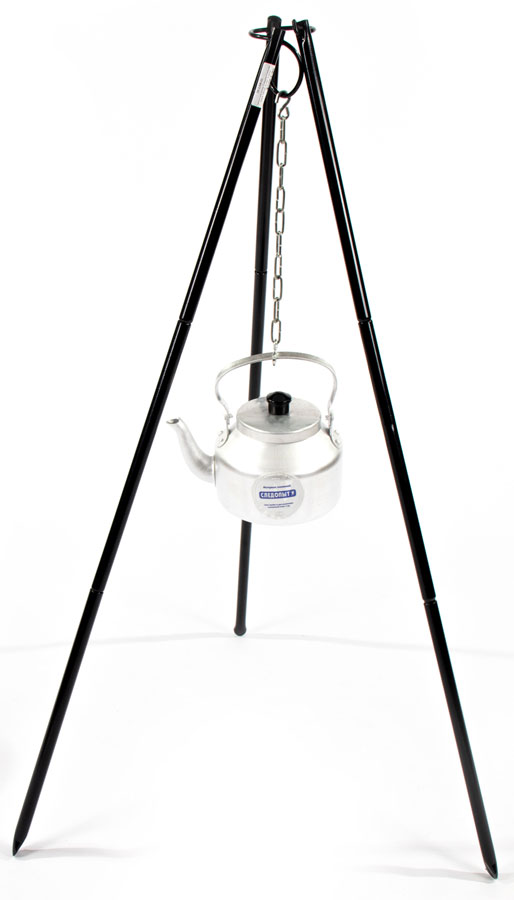 Тренога состоит из трех опор, соединенных в одной точке сверху, к этой же точке присоединен костровой крюк на который подвешивается казан, котелок или чайник. Каждая опора в свою очередь состоит из 3-х секций, благодаря чему компактно убирается в чехол после использования. Можно регулировать высоту над костром, если ставить не все секции. Размер в чехле ? 90*90*370 мм. Высота в собранном виде 1200 мм. Каркас ? сталь 16 х 1 мм с покрытием от царапин и коррозии.