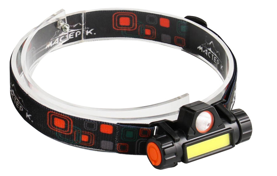 Базовый налобный фонарь с двумя светодиодами XPE/COB (5 Вт). Четыре режима работы. Эластичная лента для крепления фонаря на голове. Угол освещения регулируется. Влагозащита. Встроенный магнит. Работает от встроенного аккумулятора (1200 mAh), USB-кабель для зарядки.