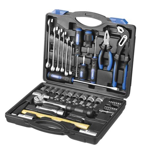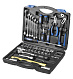 В наборе: головки торцевые 1/2" - 10 шт. (10-27 мм), головки торцевые 1/4" - 6 шт. (8-13 мм), головки торцевые свечные 1/2" с резиновой вставкой - 2 шт. (16 мм и 21 мм), удлинитель 1/2" - 125 мм, шарнир карданный - 1/2", вороток-отвёртка 1/4" (150 мм), трещотка 72 зубца - 1/2", ключи гаечные комбинированные - 6 шт.( 10-17 мм), молоток, плоскогубцы - 160 мм, клещи переставные - 250 мм, имбусовые ключи - 4 шт. (1,5-4 мм), переходники для бит - 2 шт. (1/4" SQ - 1/4" HEX), биты-головки 1/4" - 14 шт., отвёртки - 5 шт. Рабочие поверхности закалены. Хроматированное покрытие для защиты от коррозии. Пластиковый кейс. Вес ~ 5 кг.