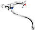 Металлический корпус с хромированной поверхностью. Тип управления - вентильный (керамический кран-букса отдельно на горячую и холодную воду). Длина излива от стены - 210 мм. Крепление на стену. В комплекте: эксцентрики, уплотнительные кольца, отражатели.