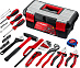 Универсальный набор инструментов для большинства ремонтных работ по дому и на даче. В наборе: молоток, плоскогубцы, бокорезы, две отвёртки, рулетка (3 метра), мини-ножовка по металлу, отвёртка-битодержатель с адаптером, биты (20 шт.), переставные клещи, разводной ключ, нож строительный, набор имбусовых ключей (8 шт.), две отвёртки для точных работ. Пластиковый ящик (33х18х15 см) с отсеком для крепежа. Вес ~ 2,8 кг.
