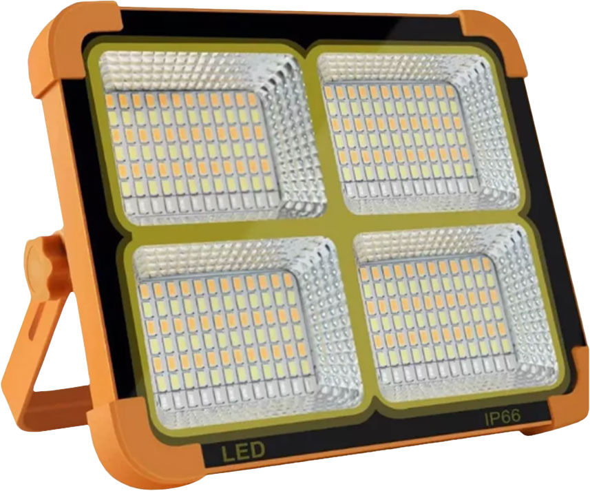 Прожектор с 3 встроенными Li-on аккумуляторами емкостью 9800 мАч обеспечивают до 20 часов непрерывной работы, имеет 336 ярких светодиодов суммарной мощностью 200 Вт, освещает большую площадь до 150 м2, 5 режимов свечения. Имеет эргономичную ручку подставку, регулируемую на 180 градусов, так же крепление крючок и магнит. Зарядка от сети 220в или от солнечной батареи. Функция быстрой зарядки Power Bank за счет мощной батареи может зарядить любое устройство в любой момент. Кабель usb type-c в комплекте.
