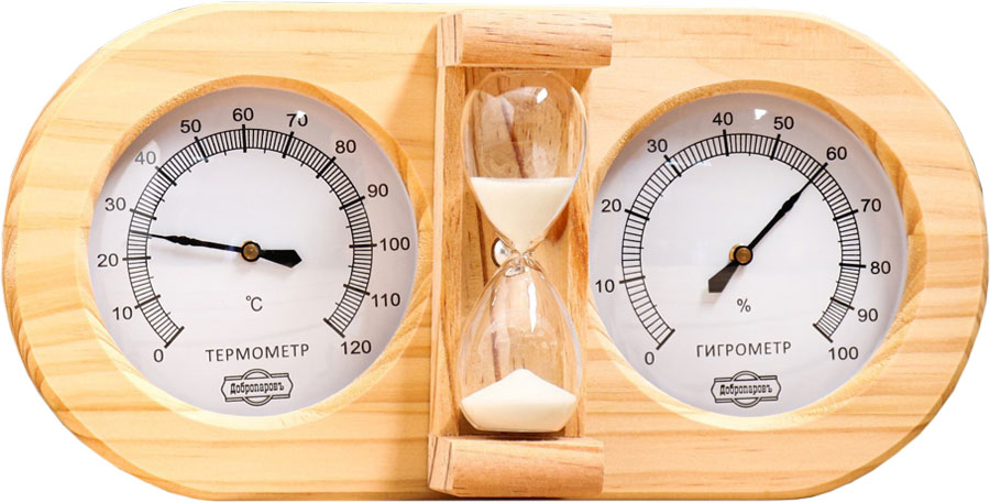 Универсальный прибор для контроля температуры и влажности в парилке. Встроенные песочные часы. Безопасная деревянная конструкция.