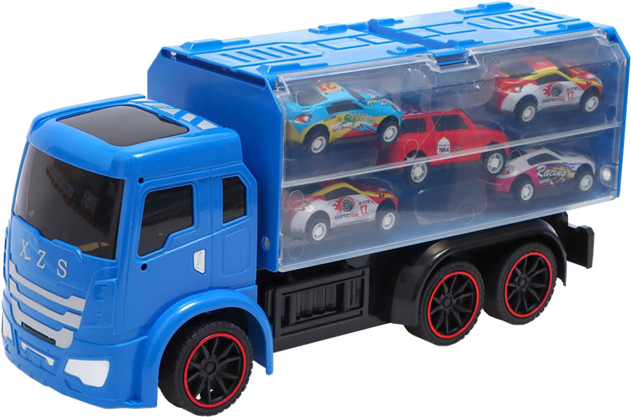 Радиоуправляемый грузовик с вместительным кузовом, в котором размещается 5 легковых инерционных машинок (7х3х3 см). Контроль движения вперёд-назад, вправо-влево. Световые эффекты. Пульт ДУ. Работает от аккумулятора, пульт от 2-х батареек типа АА. Размер: 28,5х9,5х13,5 см.