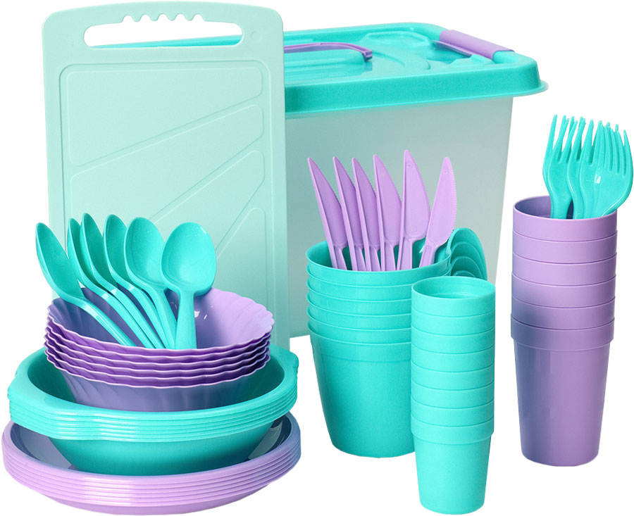 Набор для пикника из пластика - отличное решение для выезда на природу! В наборе: доска разделочная, 6 тарелок суповых (700 мл), 6 тарелок десертных (d=19,5 см), 6 салатников (500 мл), 6 стаканов (250 мл), 6 кружек (400 мл), 6 стопок (100 мл), 2 солонки, 6 вилок, 6 ложек, 6 ножей. пластиковый бокс (10 литров). Вес комплекта ~ 1,5 кг.