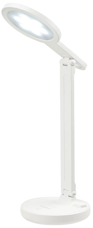 Современная аккумуляторная настольная светодиодная лампа с плоским круглым плафоном с 20ю LED элементами. Мощность - 5 Вт. Три режима освещения. Регулировка яркости. Сенсорная кнопка. Высота лампы - 35 см. Поворот плафона и регулировка угла наклона. Работает от встроенного аккумулятора, USB-кабель для зарядки.