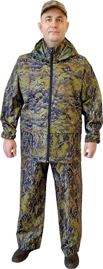 В комплекте прямая куртка с капюшоном на молнии, 2 накладных кармана с клапаном и прямые брюки с поясом на резинке, 2 накладных кармана. Материал: оксфорд плащевая.