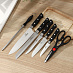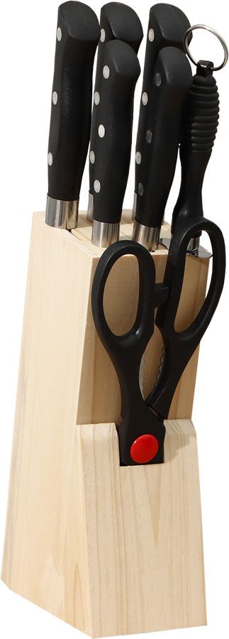 В наборе: поварской нож, разделочный нож, нож для резки хлеба, универсальный нож, нож для очистки, кухонные ножницы, мусат для заточки лезвий. Лезвия из нержавеющей прокатной стали. Эргономичные пластмассовые ручки. Классическая деревянная подставка.
