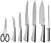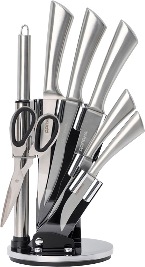 Нержавеющая сталь. В наборе: поварской нож, разделочный нож, нож для резки хлеба, универсальный нож, овощной нож, кухонные ножницы, мусат для заточки лезвий. Надёжный цельнометаллический дизайн ножей. Оригинальная подставка.