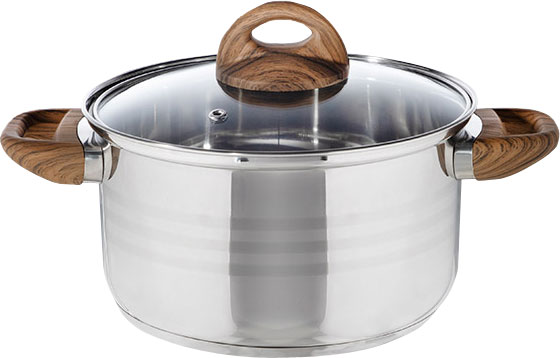 Высококачественная нержавеющая сталь с бакелитовыми ручками под дерево soft-touch. Толщина стенок - 0,4 мм. Трёхслойное капсулированное индукционное дно. Отметки литража. Крышка из жаропрочного стекла с отверстием для выпуска пара.