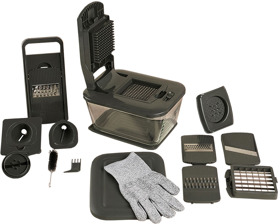 9 сменных насадок позволяют готовить нарезку любой формы и размера ? от тонких ломтиков до кубиков и терки. Лезвия из нержавеющей стали. Контейнер из жаропрочного стекла (2,75 литра) с крышкой и встроенный дуршлаг позволяют легко мыть и сушить нарезанные овощи прямо в процессе приготовления. Несмотря на свою многофункциональность, овощерезка занимает минимум места на кухне. В комплекте: держатель, перчатки, коврик, ёршик для чистки. Вес комплекта ~ 2,6 кг.