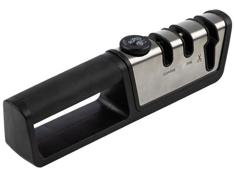 Три слота для заточки ножей и ножниц. Два этапа заточки: основная заточка лезвия и окончательная полировка и устранения заусенцев на лезвии ножа. Регулируемый угол заточки. Ножи следует точить с умеренным нажатием только в сторону на себя. Нескользящее основание из термопластичной резины.