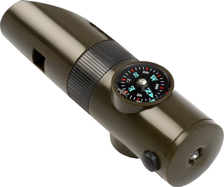 Компактное многофункциональное устройство: магнитный компас, свисток, фонарик, термометр. Шнурок на шею. Вес - 45 гр.