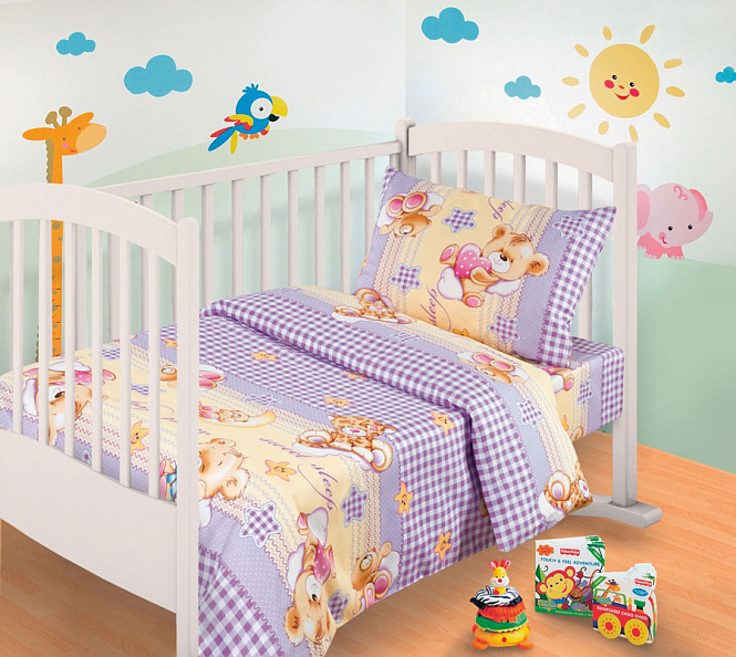 Размер: детский. Материал: бязь. Состав: пододеяльник 1 шт (110х145см), простыня 1 шт (100х145см), наволочка 1 шт (40х60см).