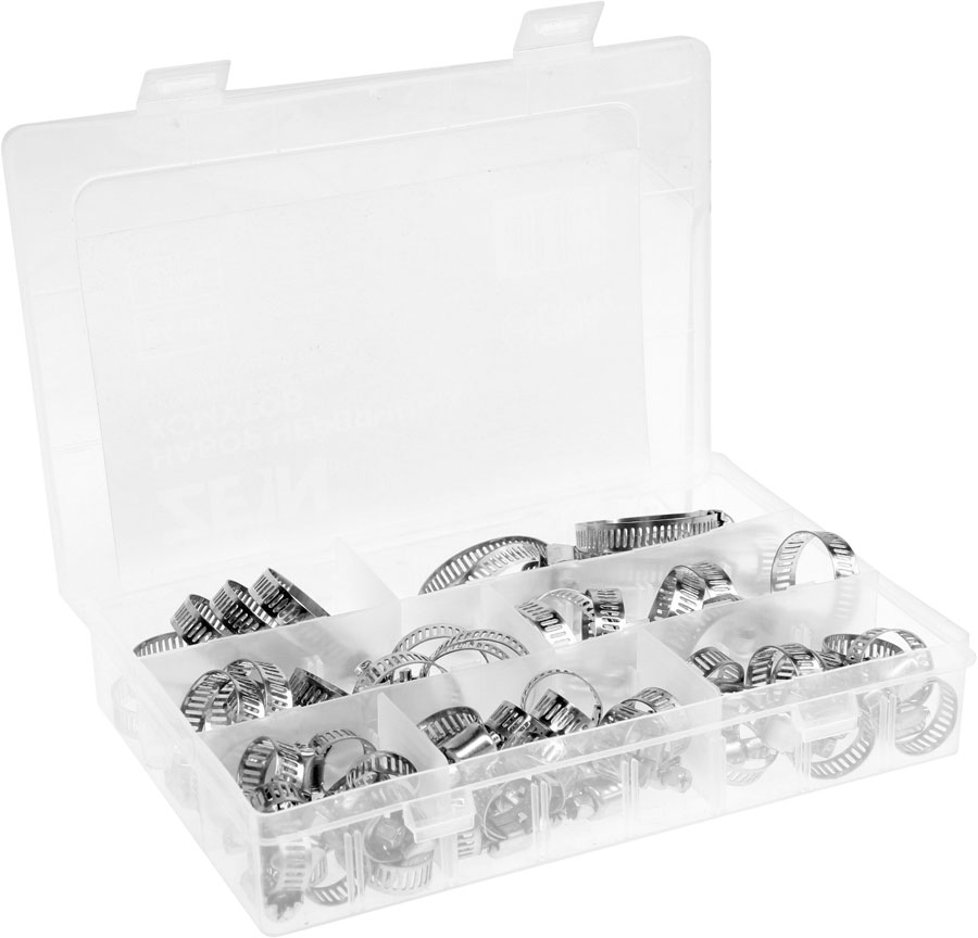 Универсальное применение для надёжного соединения и ремонта труб, шлангов и т.п. Диаметр хомутов от 8 до 38 мм. Всего 64 предмета по 5-12 штук каждого размера. Нержавеющая сталь. Сквозная просечка. Ширина - 8 мм. Удобный пластиковый органайзер для хранения.