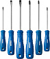 Шесть самых нужных в хозяйстве отвёрток с прямым и крестовым шлицем. Длина стержней 75-100 мм. Стержни отвёрток из хромомолибденовой стали со специальной закалкой. Эргономичные рукоятки.