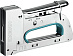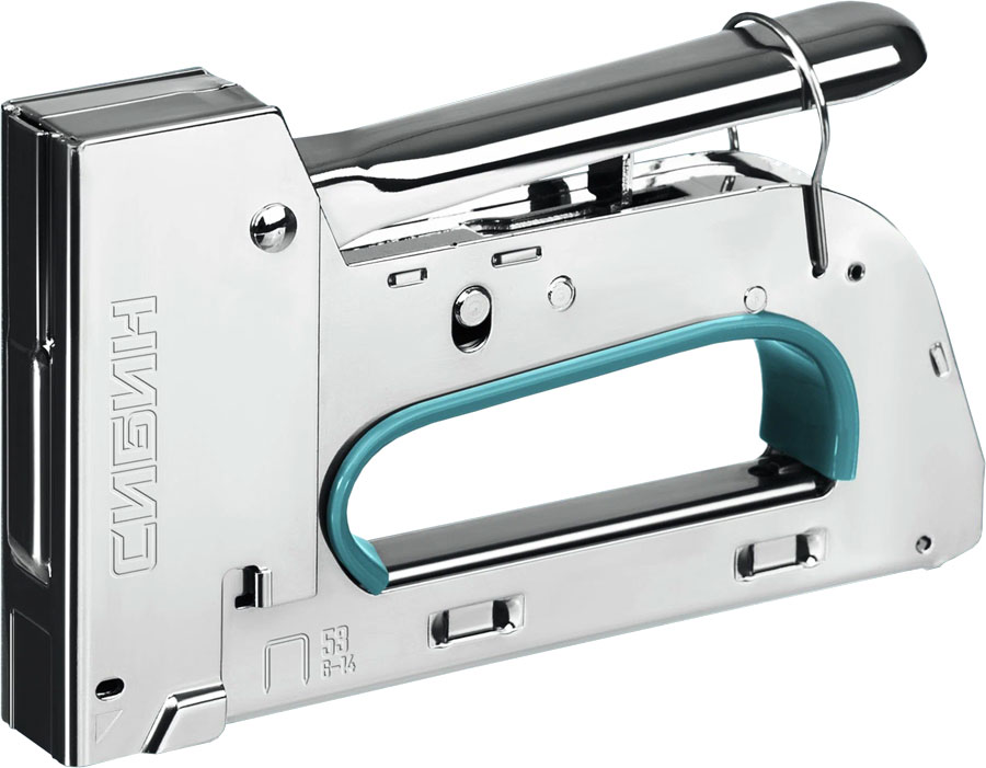 Для крепления тканных материалов (ткани, обивки, холста) и материалов не несущих высоких нагрузок к поверхности из дерева, ДВП, пластика и т.п. Тип и размер используемых скоб - 53 (6 -14 мм). Утолщённый хромированный металлический корпус. Ударный механизм рессорного типа обеспечивает максимальную мощность и низкую отдачу. Двухпозиционная регулировка силы удара. Боек из закаленной инструментальной стали. Резиновая вставка снижает отдачу при работе. Фиксация рукоятки сдвигом без удара. Индикатор наличия скоб в магазине.