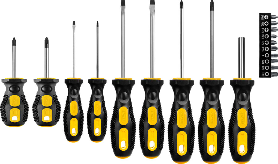 В наборе: 8 отвёрток с разной длиной стержня (100, 75, 38 мм), отвёртка-битодержатель, набор бит (10 шт). Магнитные наконечники. Двухкомпонентные рукоятки оптимальной формы обеспечивают надёжный и комфортный захват