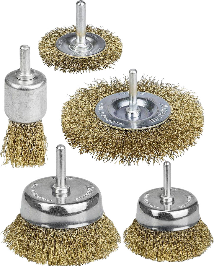 Применяются на дрели для удаления краски, ржавчины, заусенцев, нагара, окалины с поверхностей изделий из стали и цветных металлов. В наборе щетка кистевая (диаметр 25 мм), две дисковые щётки (50 и 75 мм), две чашечные щётки 50 и 75 мм.). Рабочая часть из стальной проволоки толщиной 0,3 мм с латунным покрытием.