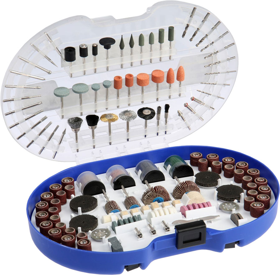 Большой набор мини-насадок для тонких работ по резке, шлифовке и полировке различных материалов (пластик, дерево, керамика, металл и т.д.). В наборе: шлифовальные круги, абразивные ленты, щётки-крацовки, отрезные круги, шарошки алмазные и абразивные, насадки полировальные, державки , свёрла и т.д. Удобный пластиковый кейс.