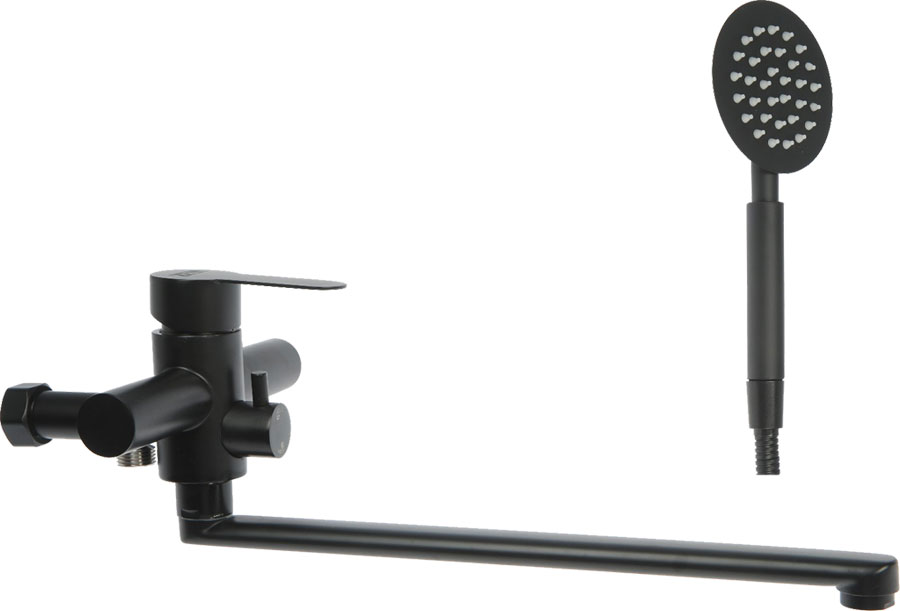 Корпус из нержавеющей стали со специальным чёрным покрытием, которое придает смесителю современный и стильный вид. Тип управления - рычажный. Керамический запорный клапан. Тип излива - поворотный, длинный (320 мм). Оснащён аэратором. В комплекте: душевой шланг и лейка, держатель душевой лейки, S-образные эксцентрики с резьбой 1/2", декоративные чашечки, уплотнительные прокладки. Вес ~ 1,9 кг.