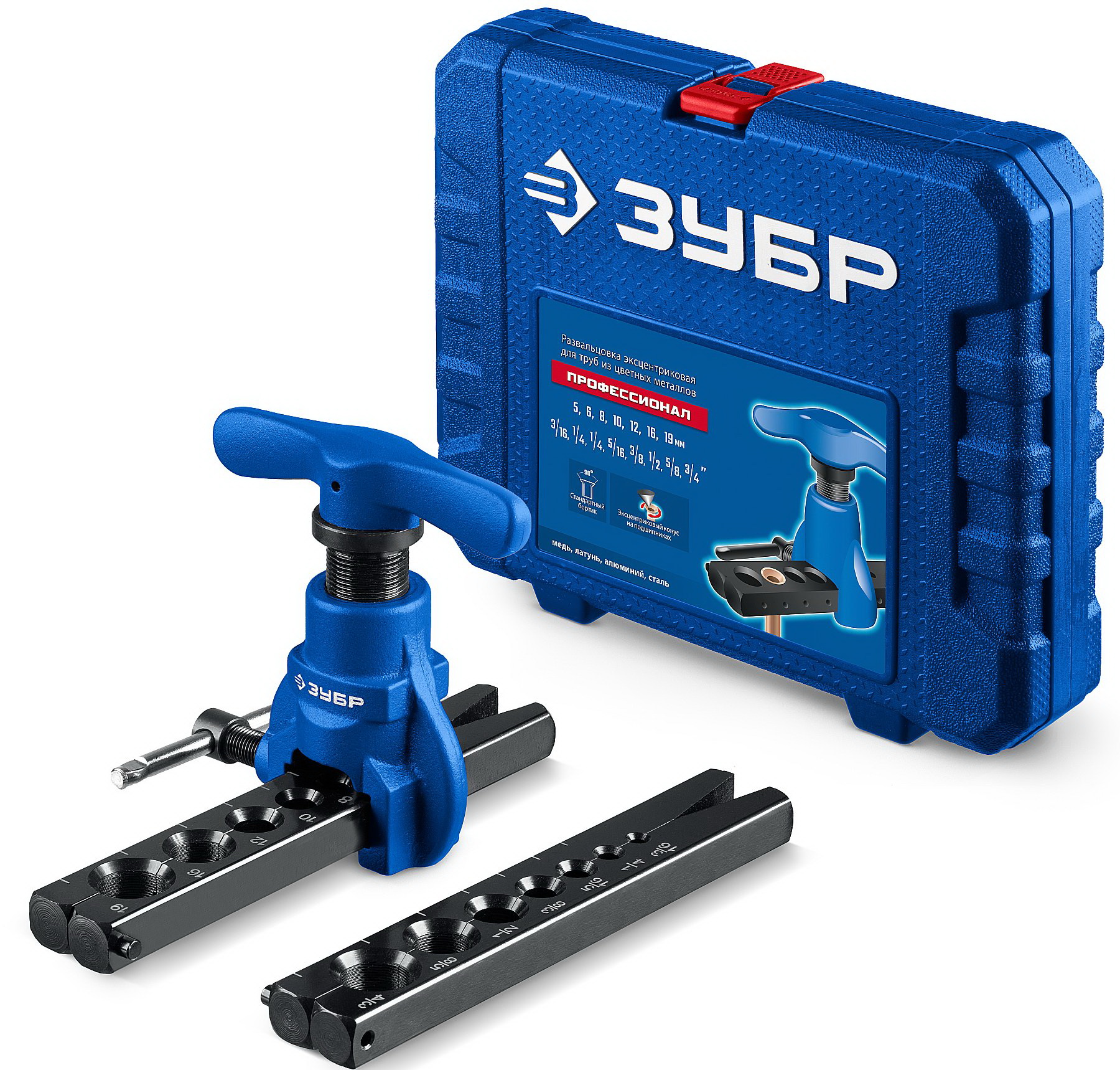 Профессиональный инструмент на подшипниках с эксцентриковым конусом и корпусом из высококачественной инструментальной стали. Для изготовления идеальных буртиков под углом 45°. Предназначен для развальцовки медных, латунных, алюминиевых и тонкостенных стальных труб. Диаметры - 5, 6, 8, 10, 12, 16, 19 мм и 3/16"; 1/4", 5/16", 3/8", 1/2", 5/8", 3/4". Кованный корпус. Самоцентрирующаяся матрица. Ограничитель момента. Пластиковый бокс. Вес комплекта ~ 2,5 кг.
