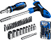 Универсальный компактный набор с реверсивной и T-образной отвёртками. Оптимальный набор бит (17 шт., 25 мм) и головок (9 шт., 4-12 мм) для работы с распространённым крепежом. Адаптер для бит. Надежный реверсивный храповый механизм. Биты из хромованадиевой стали, закалены и обладают отличным балансом прочности, твердости и надежности. Хромированное покрытие защищает от коррозии. Возможно хранение бит в рукоятке. Пластиковый кейс с надёжными фиксаторами. Вес ~ 0,75 кг.